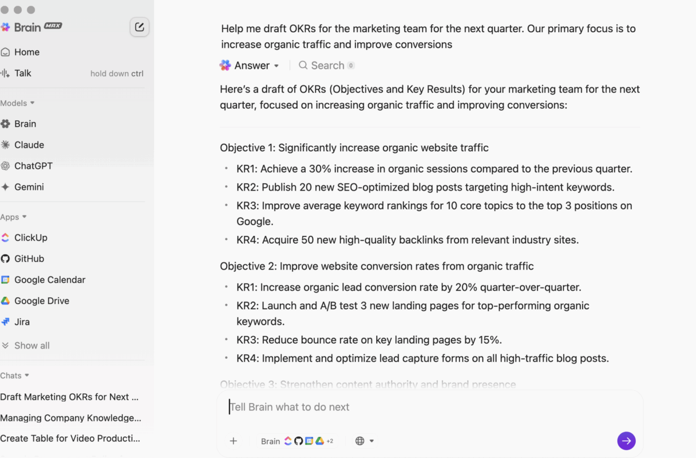 💡 نصيحة احترافية: هل تحتاج إلى مساعدة أو إلهام لوضع OKRs لنفسك وفريقك؟ ما عليك سوى أن تسأل ClickUp Brain MAX. بفضل وصوله إلى مساحة عملك ومعرفتك المؤسسية، يمكنه القيام بعمل جيد جدًا.