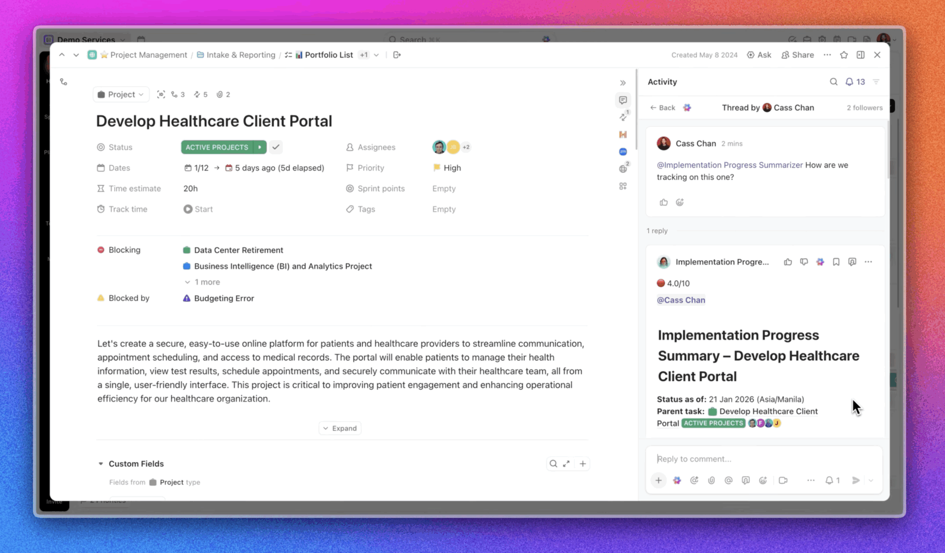 AI анализира забавянията в задачите, настроенията в коментарите и зависимостите в задачите в ClickUp, за да събере информация. Ще получите предупреждение, когато задача от критичния път е изложена на риск, заедно с контекста за причината и предложени действия, което ви позволява да защитите маржовете си и да запазите клиентите си доволни.