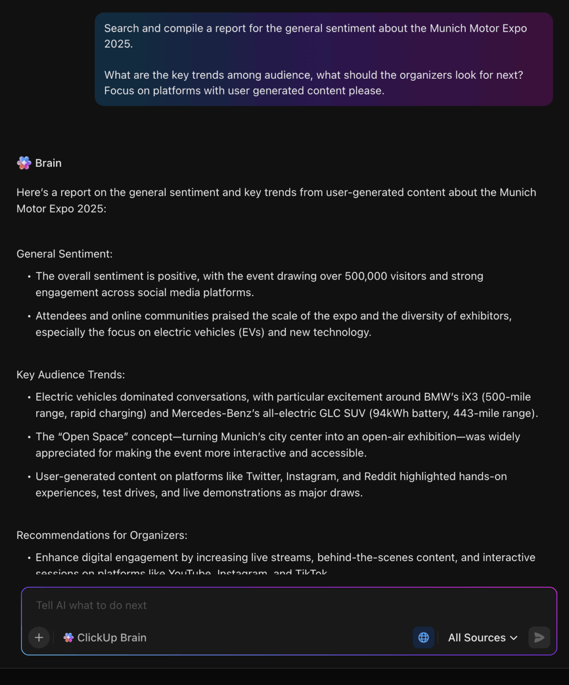 Now it’s time to automate personalized communications. ClickUp Brain, the built-in AI assistant within the workspace, along with ClickUp Agents, can help you draft and send tailored emails, generate follow-ups, and even summarize feedback, so every attendee gets a personal touch, automatically.