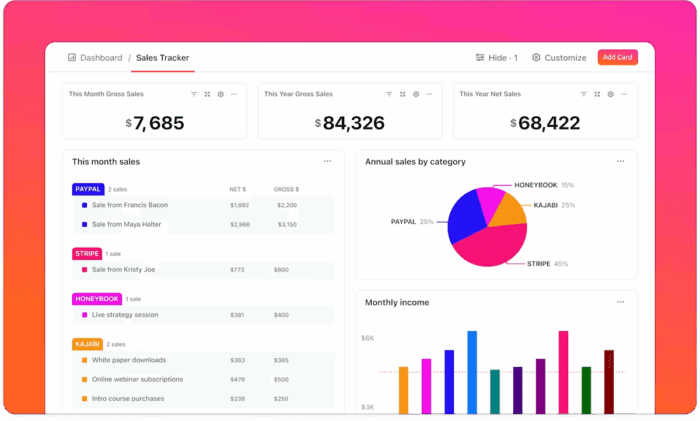 Then, bring it all together in a central command center with ClickUp Dashboards. These are high-level views of your work that you can build with customizable widgets and AI Cards. Dashboards can automatically track: