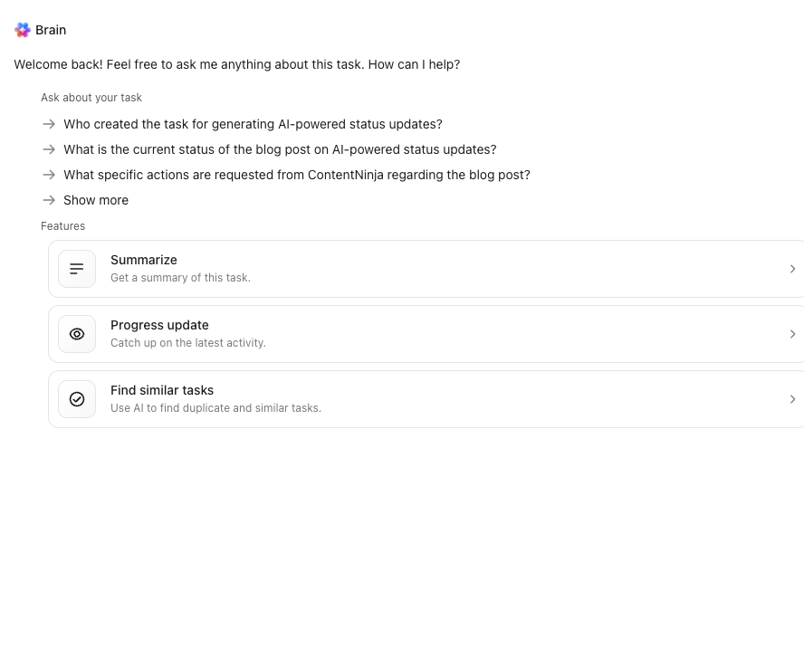 You can open a stand-up list or sprint board, ask ClickUp Brain for a summary, and instantly receive a clear digest of progress, blockers, and action items.