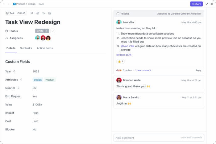 You can add a recurring task called “Daily Stand-up” with subtasks for each person, or let team members post their updates as comments on the same task. The integration of linked work, progress, and potential blockers ensures that nothing is overlooked.