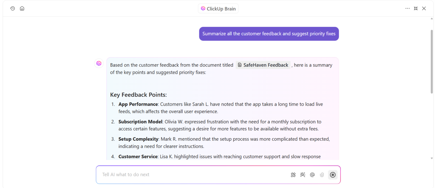 Suppose hundreds of customer support tickets mention issues after a recent product update. ClickUp Brain scans the tickets, highlights recurring problems, and suggests priority fixes.