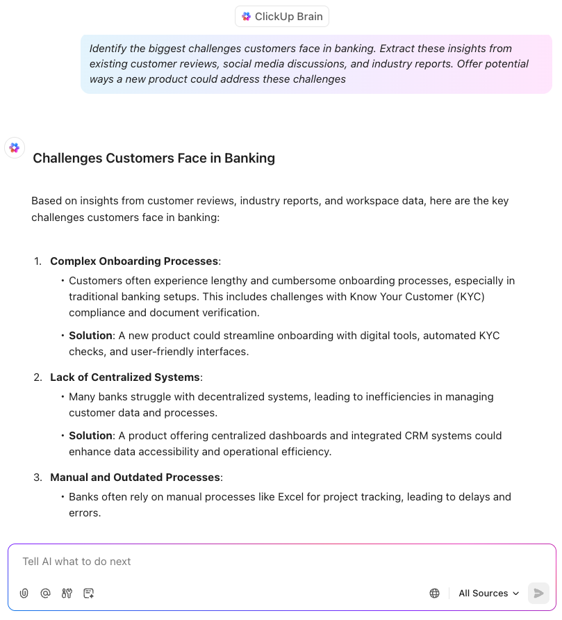 ClickUp Brain also helps refine feature requests. Let’s say a new product enhancement is being considered. Instead of spending hours reviewing scattered notes and past discussions, AI generates a structured proposal via ClickUp Docs, with user pain points, supporting data, and potential solutions.