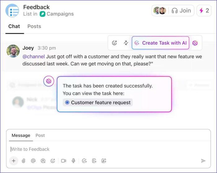 Let’s say a weekly model review surfaces performance issues. The AI Notetaker records the meeting, generates a concise summary, and extracts action items. You can convert these to ClickUp Tasks linked to the relevant project.