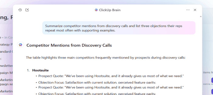 For example, suppose you paste three competitor landing pages into a doc. ClickUp Brain highlights their positioning: two competitors focus on integrations, while one emphasizes customer service.