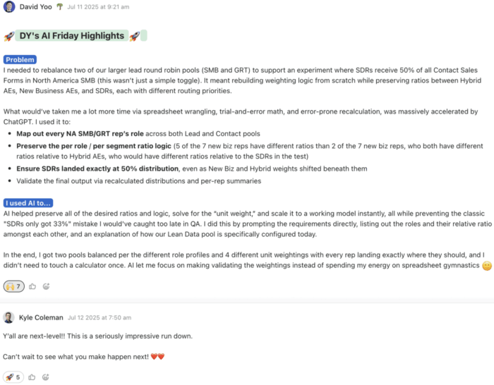 We ran this for about six weeks. And then something clicked. We didn’t need the mandate anymore. People were hooked. The pressure came off because using AI didn’t have to be world-changing. It just needed to make you 1% better every day.