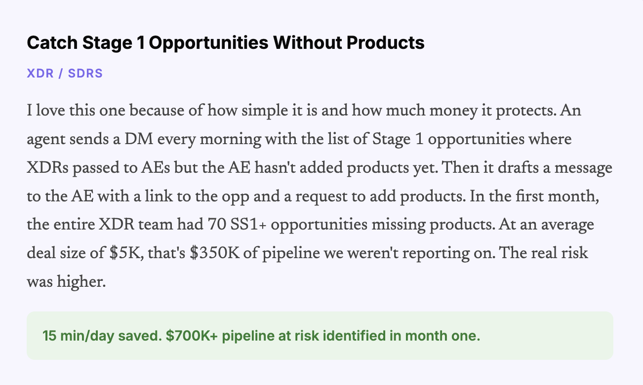 | XDR / SDRs | SS1 Opportunity Pipeline Guardian | $700K pipeline at risk caught in month one. |