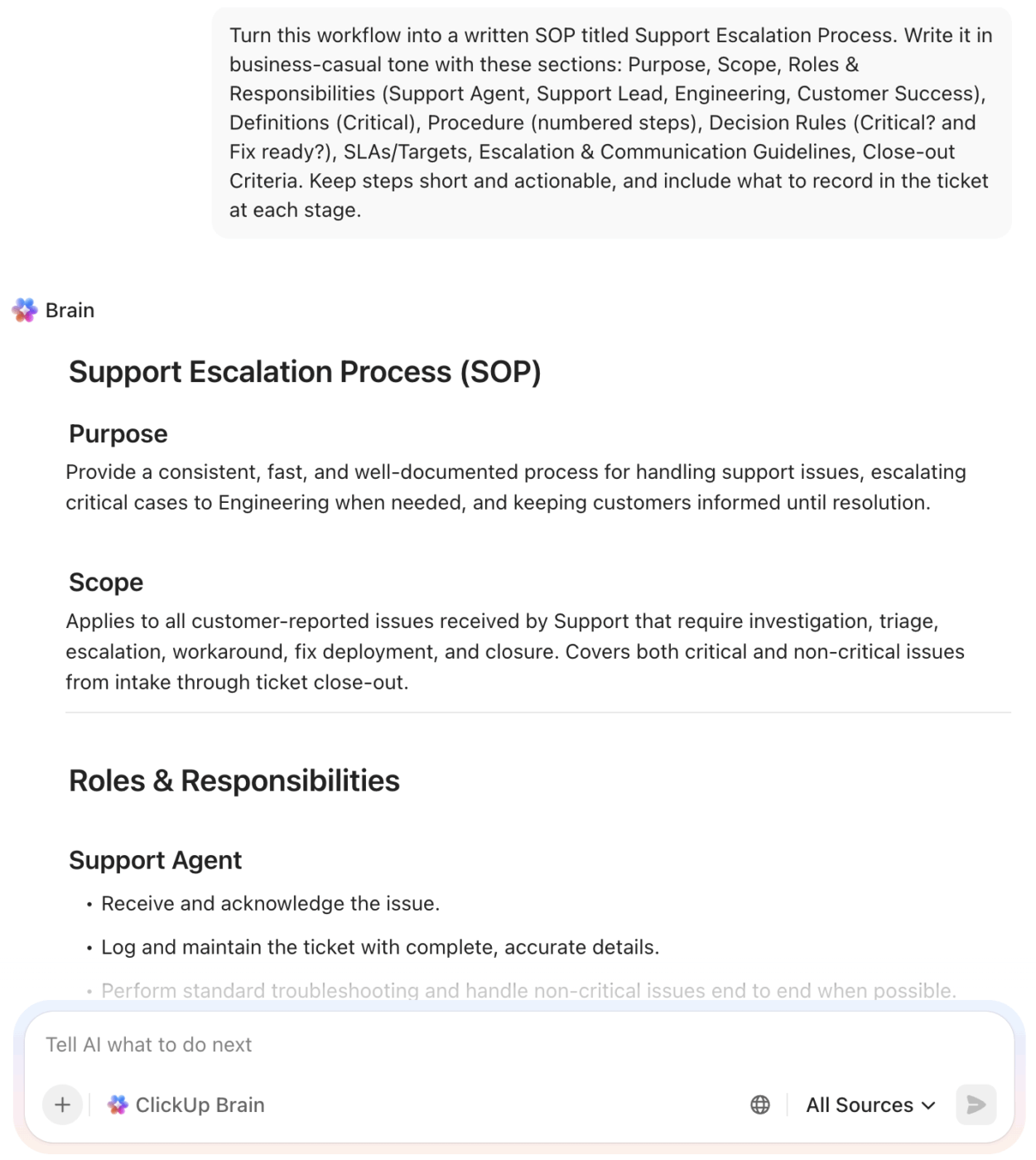 Now’s the time to use ClickUp Brain to speed up the first draft. You can use it on Whiteboards or directly from the sidebar (your choice).