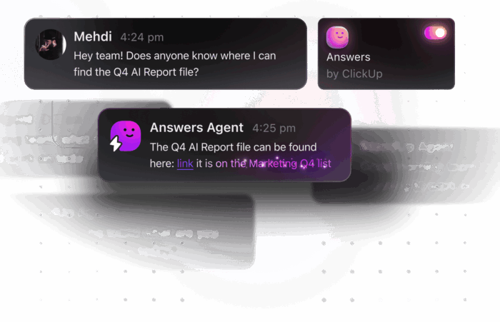 ClickUp includes multiple types of these ambient agents that can answer questions in chat, take actions as a part of your workflows, adapt to user feedback over time, and even update your company knowledge in the background.