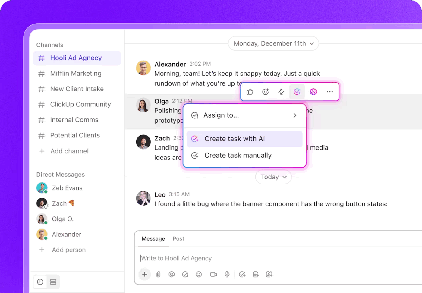 AI in context: Generate content, summaries, and action items directly within a ClickUp Doc or task. The output is already where it needs to be—no more copy-pasting and context-switching