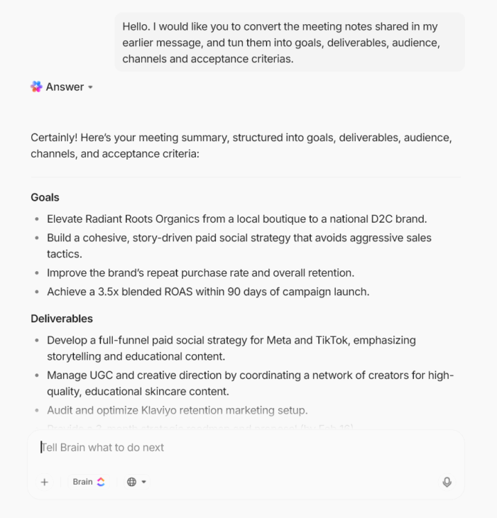 The solution is to consolidate where it makes sense and use a central hub for orchestration. This is where ClickUp’s converged AI workspace for agencies makes the biggest difference. It’s a single campaign source of truth your team and clients can trust.