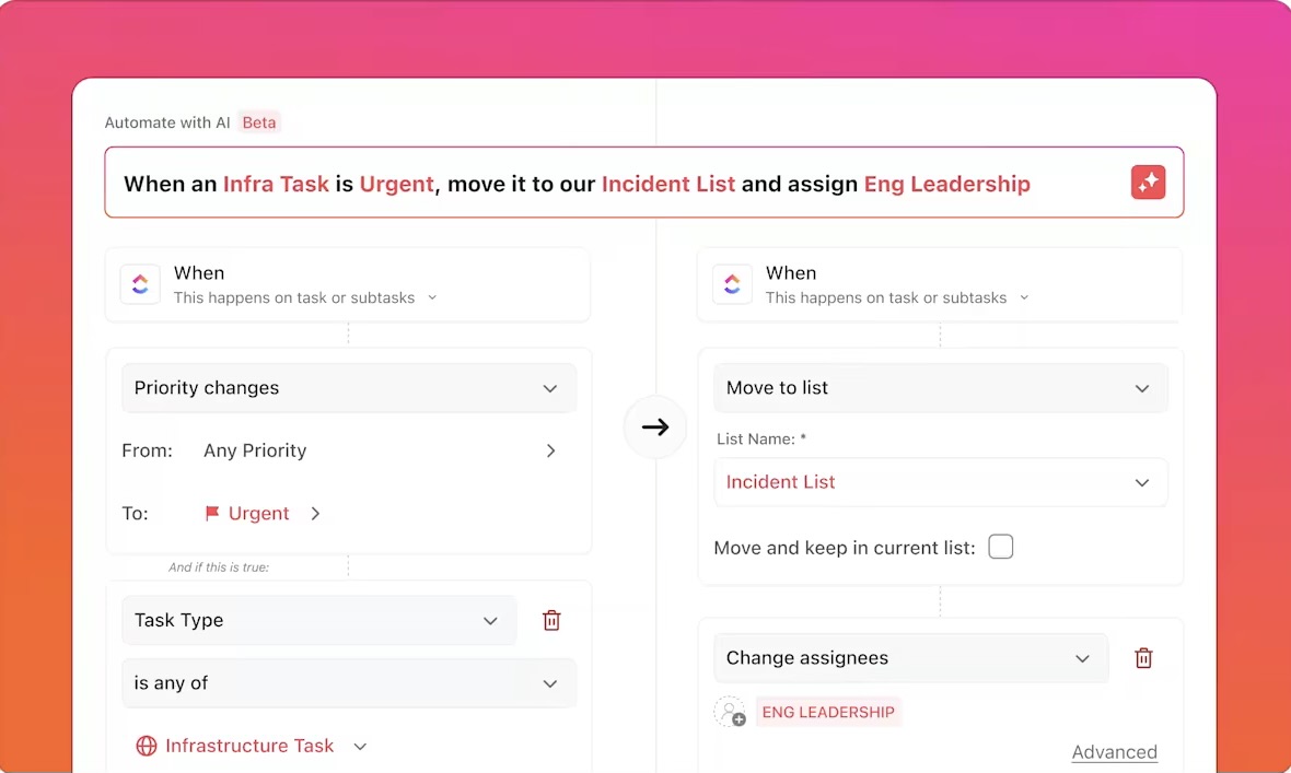 ClickUp Brain’s AI-powered Automation Builder lets you describe workflows in plain language, instantly setting up automations across Spaces, Folders, and Lists.