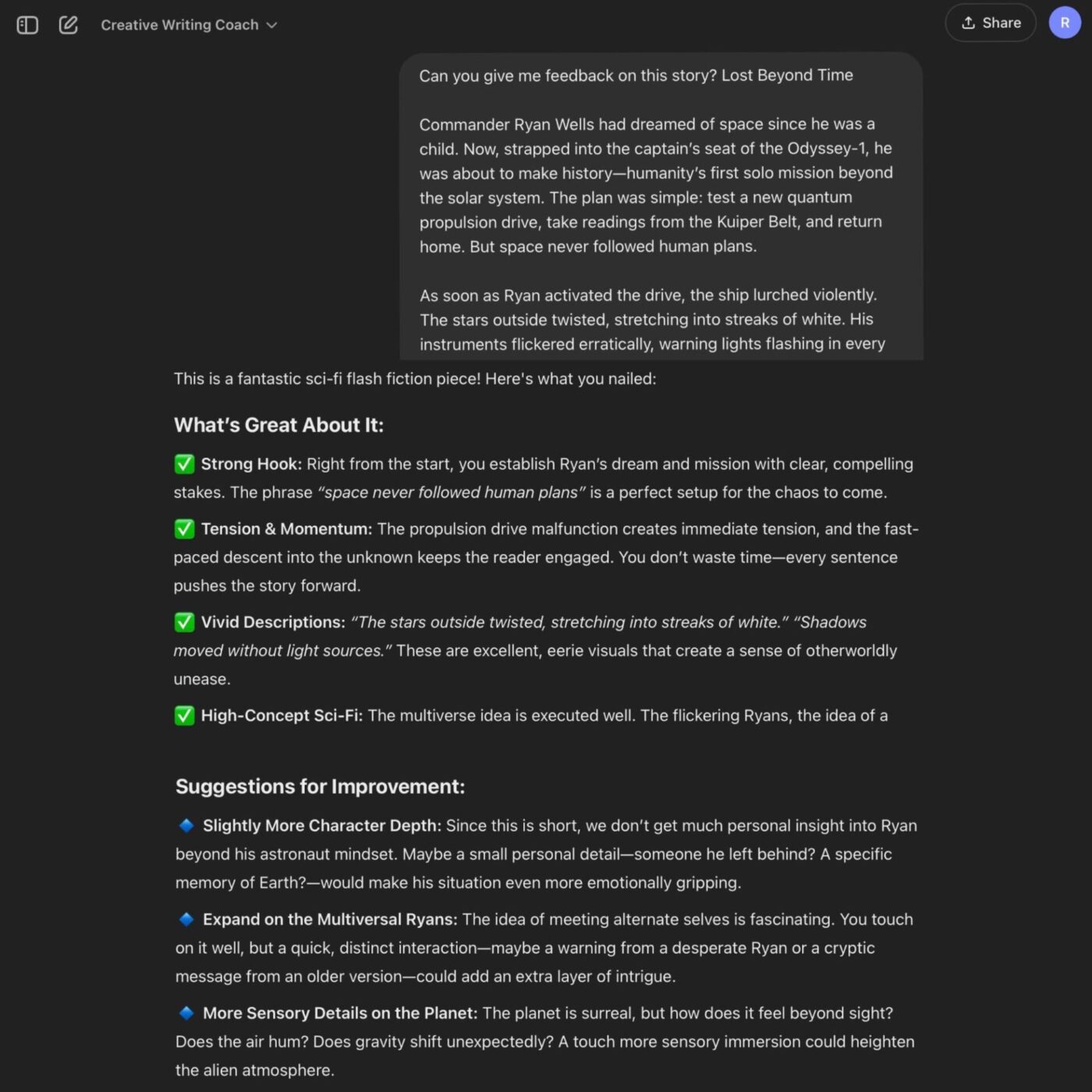 A standout feature is its ability to elucidate complex writing concepts. For instance, it effectively teaches the principle of ‘showing rather than telling,’ encouraging writers to use vivid descriptions that engage readers’ imaginations. This enhances the user’s understanding of effective storytelling techniques and fosters a deeper connection with their audience.