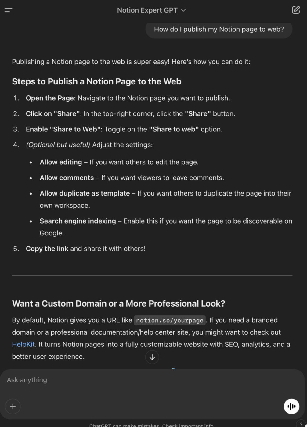 Beyond basic support, it helps users stay organized with strategies for managing notes, structuring databases, and keeping schedules on track. Students can create study guides and organize research efficiently, while professionals can refine workflows and keep projects running smoothly. Compared to traditional AI project management tools, this one aims to optimize your workflow and enhance productivity within Notion.