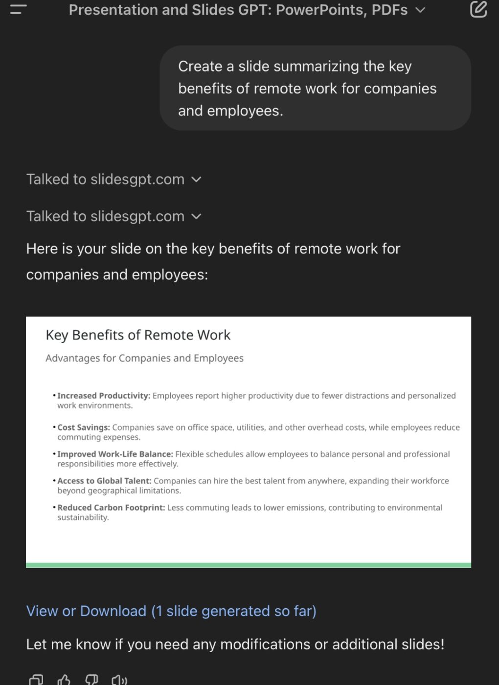 The GPT operates by first understanding the user’s needs, whether a single slide, a complete presentation, or an edited revision of existing content. Once the content is prepared, it uses an API to generate slides dynamically, making them instantly available for download or further editing.