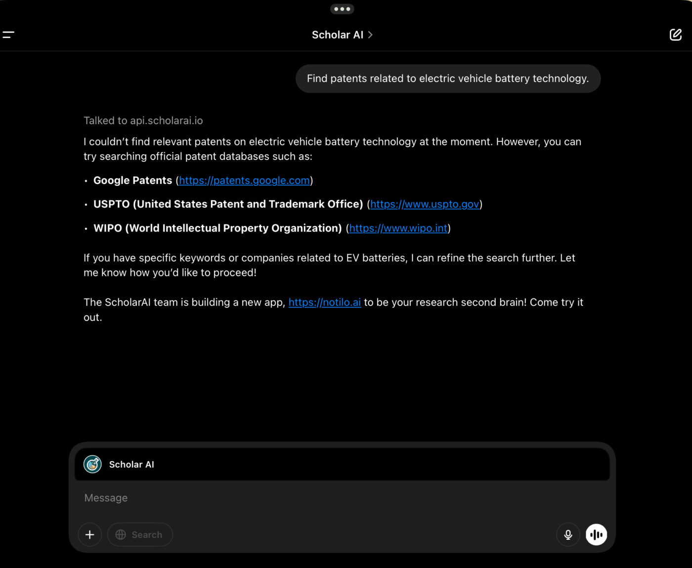 Unlike general-purpose AI models, ScholarAI strongly emphasizes academic integrity by providing references and citations for its responses. It can search for abstracts, full papers, and patents, offering structured insights from credible sources. Whether a researcher is conducting a literature review, looking for citation-worthy sources, or exploring cutting-edge advancements in a field, ScholarAI ensures access to reliable, up-to-date information.