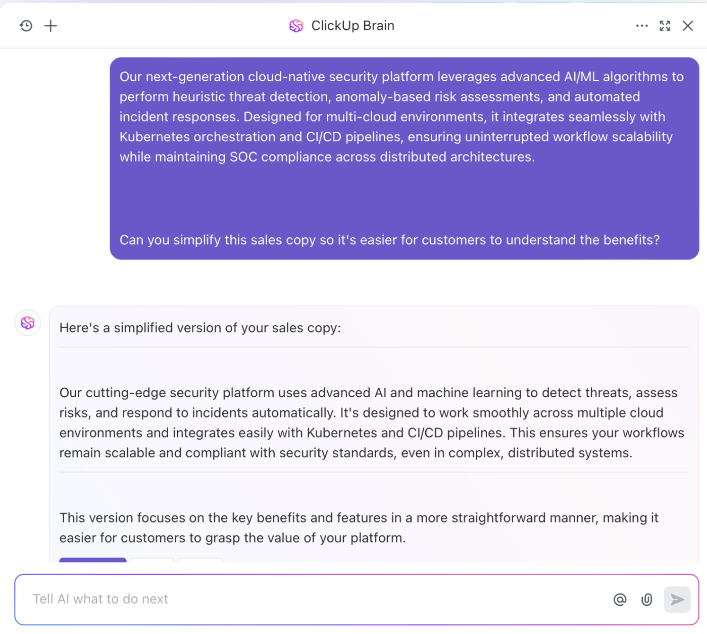 ClickUp Brain is your AI writing assistant, directly integrating AI into your workflow and daily processes. This allows you to generate high-quality content, refine drafts, and structure your writing for maximum impact.