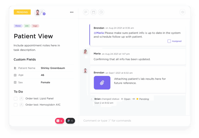 Keeping track of every patient’s medical history, lab results, conditions, and more is crucial for running a successful practice. ClickUp’s Patient Management Template helps save time on organizing your database so you can focus on what truly matters: giving the best care possible!