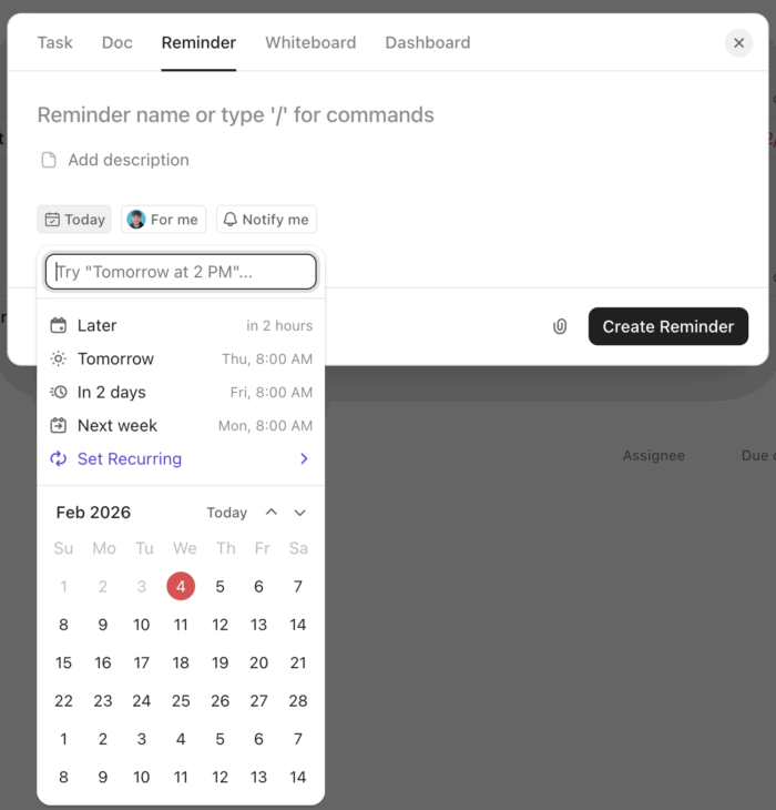 Without a unified system for capturing decisions, key insights you need may get buried in chats, emails, or spreadsheets. With ClickUp’s built-in reminders, you’ll always stay on top of your tasks—ensuring nothing falls through the cracks. Plus you can add exact time estimates and date details too!