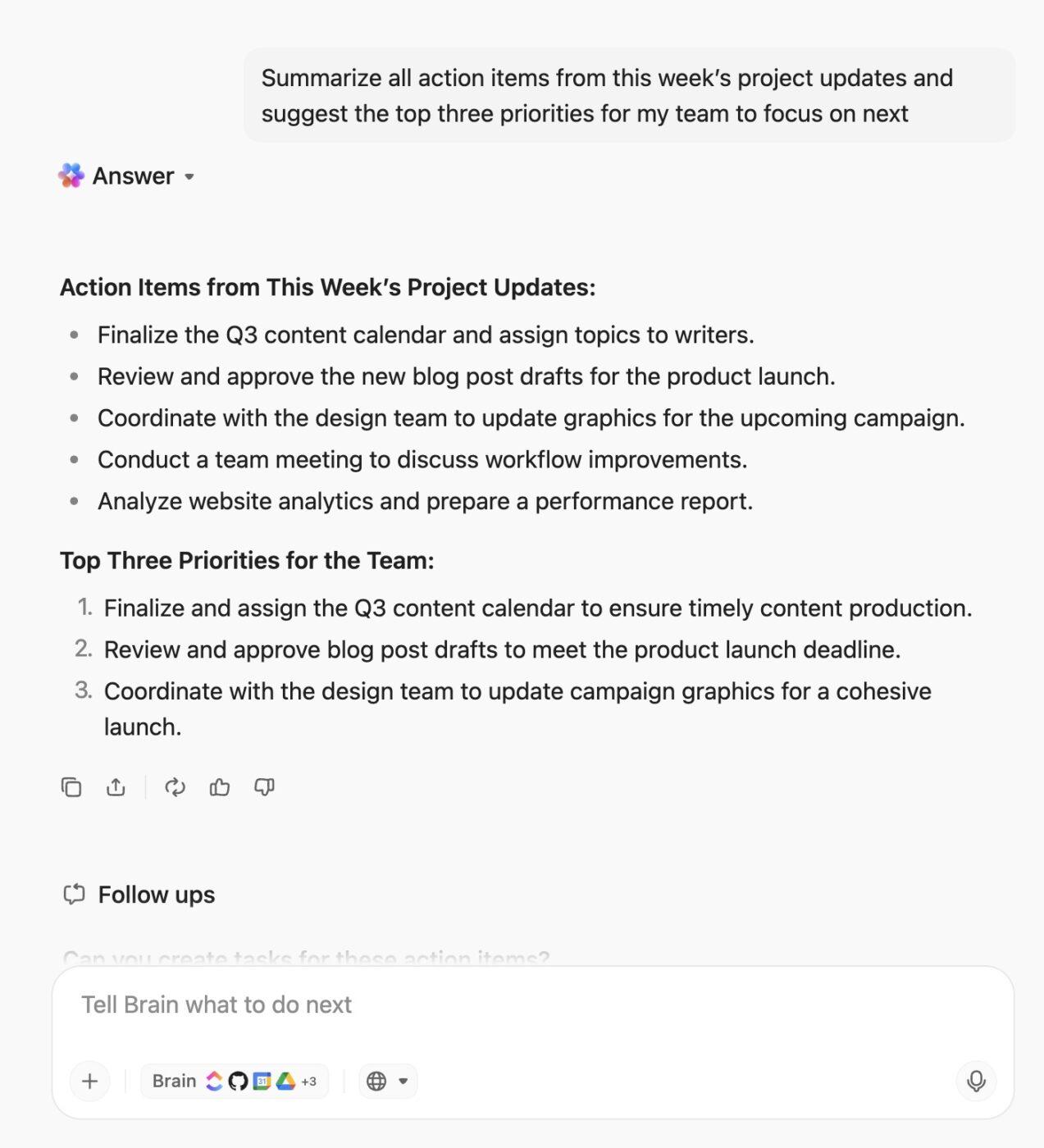 ClickUp Brain creates a neural layer on your workspace that constantly maps relationships across tasks, docs, and people. This lets it do three things better than any other apps: