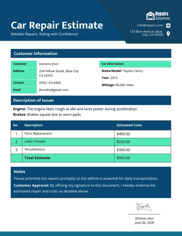 This visually polished PDF-style template is ideal for client-facing estimates that need a branded appearance. The Venngage Car Repair Estimate Template lets you drag and drop branding elements, modify colors, and style your quote professionally.