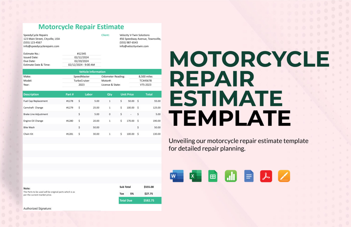 | Motorcycle Repair Estimate Template by Template.net | Download This Template | Motorcycle garages, tuning specialists | Bike-specific fields, clean layout, multi-format | Word, PDF, Google Docs |