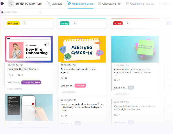 The ClickUp 30-60-90 Day Plan Template is a versatile resource. Its features can help you map out a solid strategy, especially if you’re a manager curating a professional development plan for your new hires.