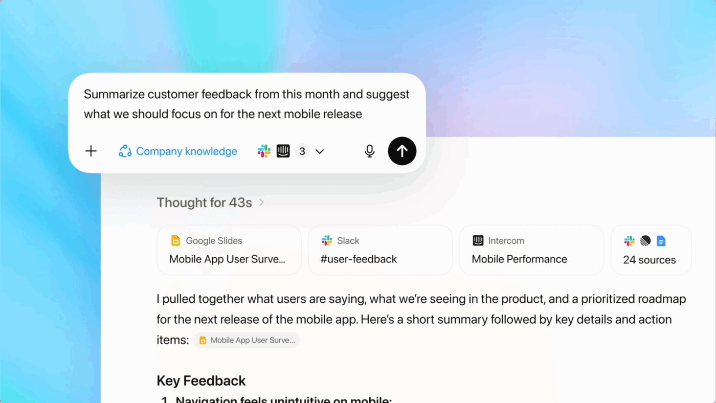 ChatGPT’s approach: It works well for organizations with established, sprawling tool stacks that want to answer ad-hoc questions spanning multiple systems. For example, a leader could ask, “What was the final decision on the Q3 launch timeline?” and get an answer synthesized from Slack, Google Docs, and Asana. It’s basically a cross-tool briefing engine.
