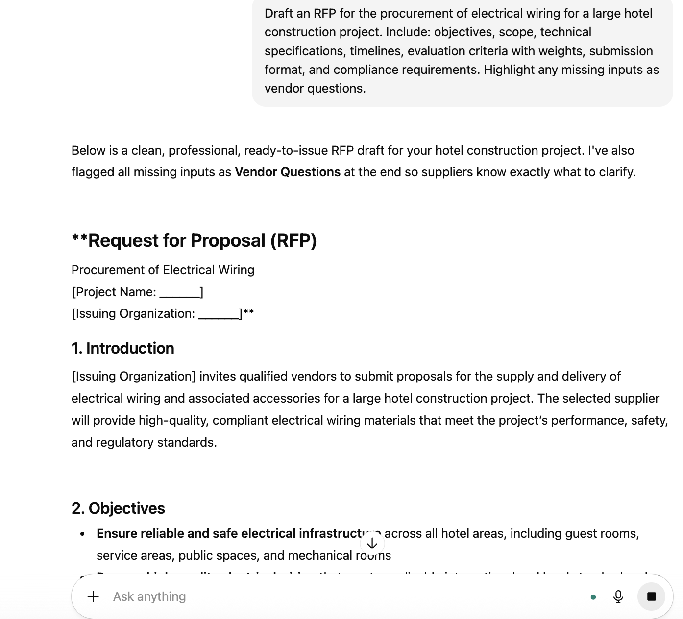 With ChatGPT, you just need to input the project context—category, volumes, sites, policies, and deadlines. Instantly, you receive a complete RFP draft with structured sections: objectives, scope, specifications, submission format, evaluation weights, and compliance notes.