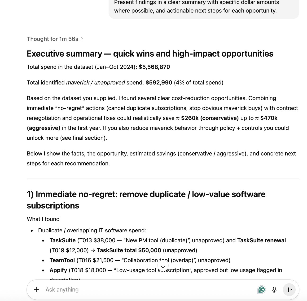 ChatGPT accelerates this by interpreting data files and summarizing the story they tell. It can highlight top categories by spend, flag duplicate suppliers, reveal unit price variances, and identify opportunities for consolidation or renegotiation.