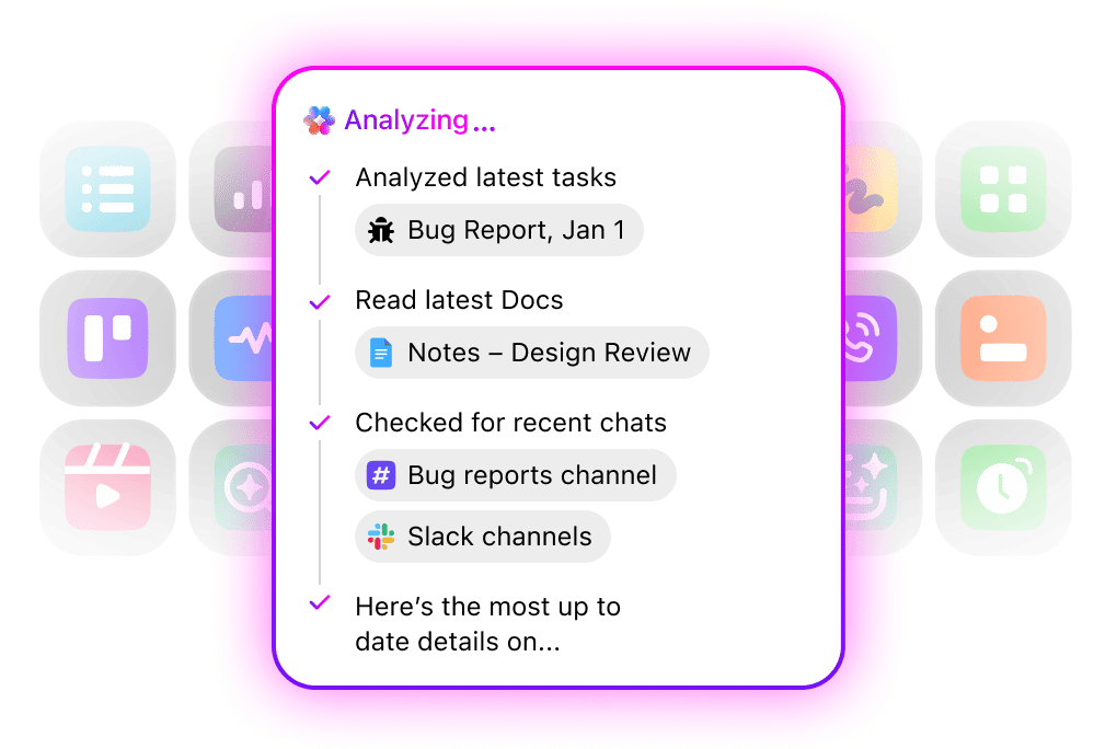- Contextual Q&A and summarization: Review full context to summarize meetings, extract insights from tasks and comments, and surface them instantly