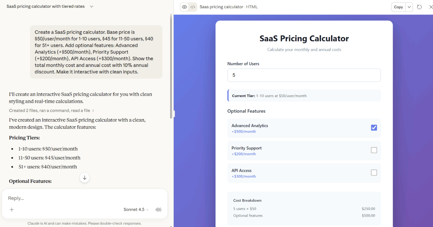 When you’re ready to move your work out of Claude, access the underlying code using the code viewer that lets you toggle between the rendered preview and the raw code. This is perfect for developers who need to integrate the output into their projects.