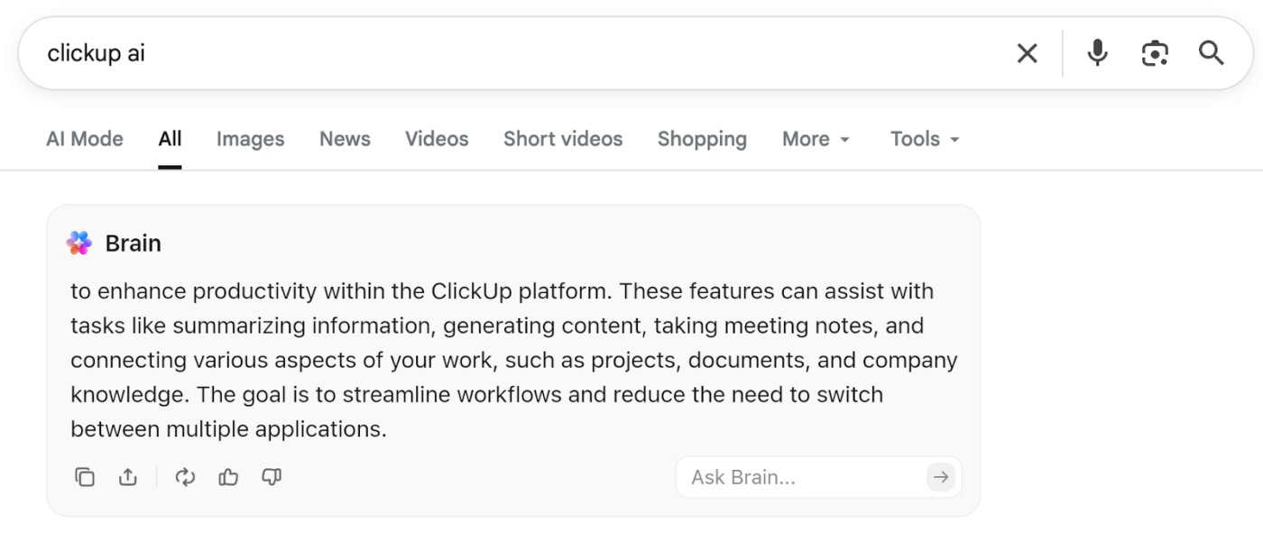 Not with ClickUp Brain, though. It lives right in your Workspace, knows what you’re working on, can understand plain text prompts, and gives you answers that are highly relevant to your tasks. Experience 2x improvement in productivity with ClickUp!