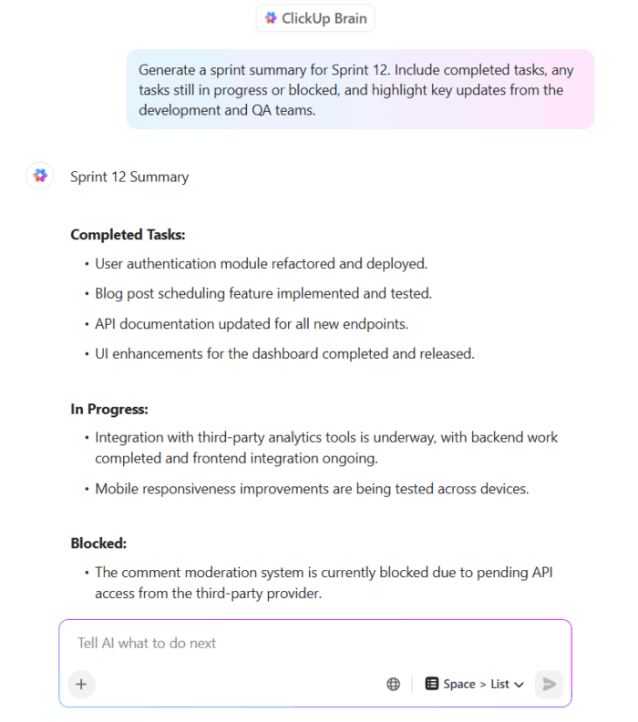 💡 Pro Tip: Eliminate this context sprawl with ClickUp Brain. Its Contextual AI pulls information directly from your connected workspace. Ask it to draft your Q2 product roadmap and it automatically references the feature requests in your backlog, the timeline from your Gantt chart, and the priorities your PM set in last week’s strategy doc.