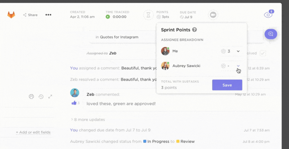 | Effort estimation and progress tracking | Track work using points or ClickUp Time Estimates. Everything stays synced with your sprint duration, start and end dates, and any tasks that spill over into the next sprint. |