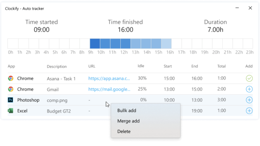 If you need to track your task time automatically based on computer activity, Clockify’s auto tracker frees you from starting or stopping timers manually.