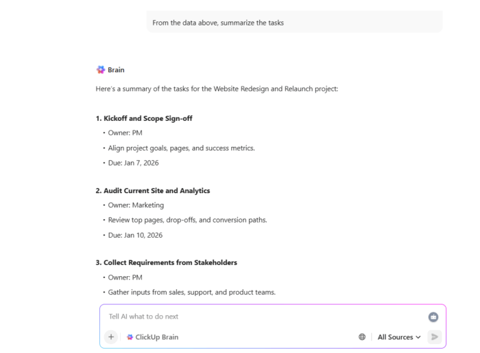 When feedback and decisions happen inside ClickUp Chat, the next risk is simple. Someone misses the thread, and you repeat the same conversation in another meeting. Use ClickUp Brain to keep momentum without flooding people with screenshots or long summaries.