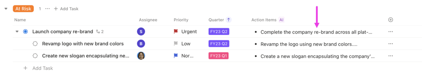 Overcome writer’s block and generate fresh ideas instantly with ClickUp Brain. This powerful AI assistant is built directly into your workspace to help you brainstorm topics, write social media captions, or create detailed content outlines. Because it has the context of your workspace, the suggestions are always relevant to your brand and ongoing projects.