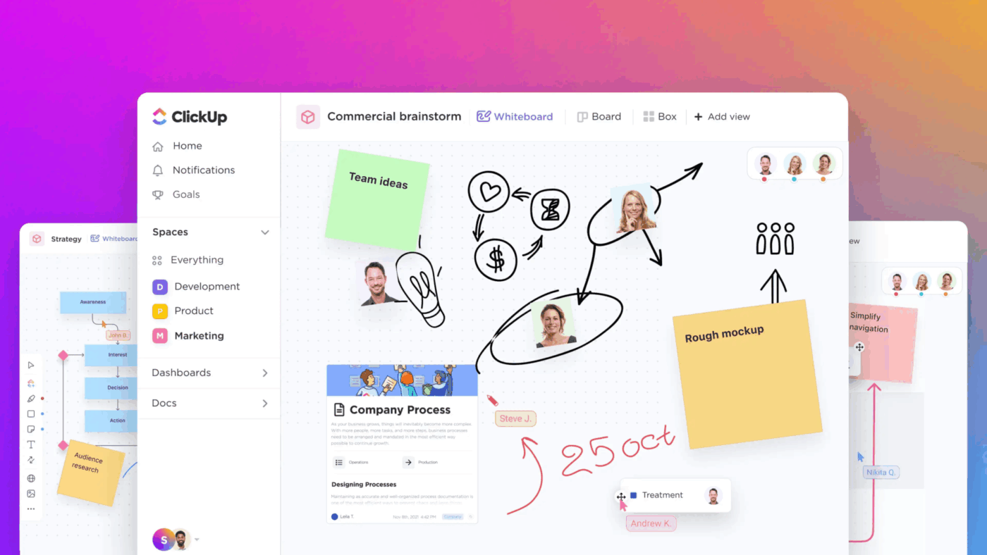 Map out your content strategy visually and brainstorm your next big campaign with ClickUp Whiteboards. This flexible canvas is perfect for creating mind maps of your content pillars, sketching out visual concepts, or building collaborative flowcharts. Your team can add ideas on digital sticky notes and connect concepts in real-time.