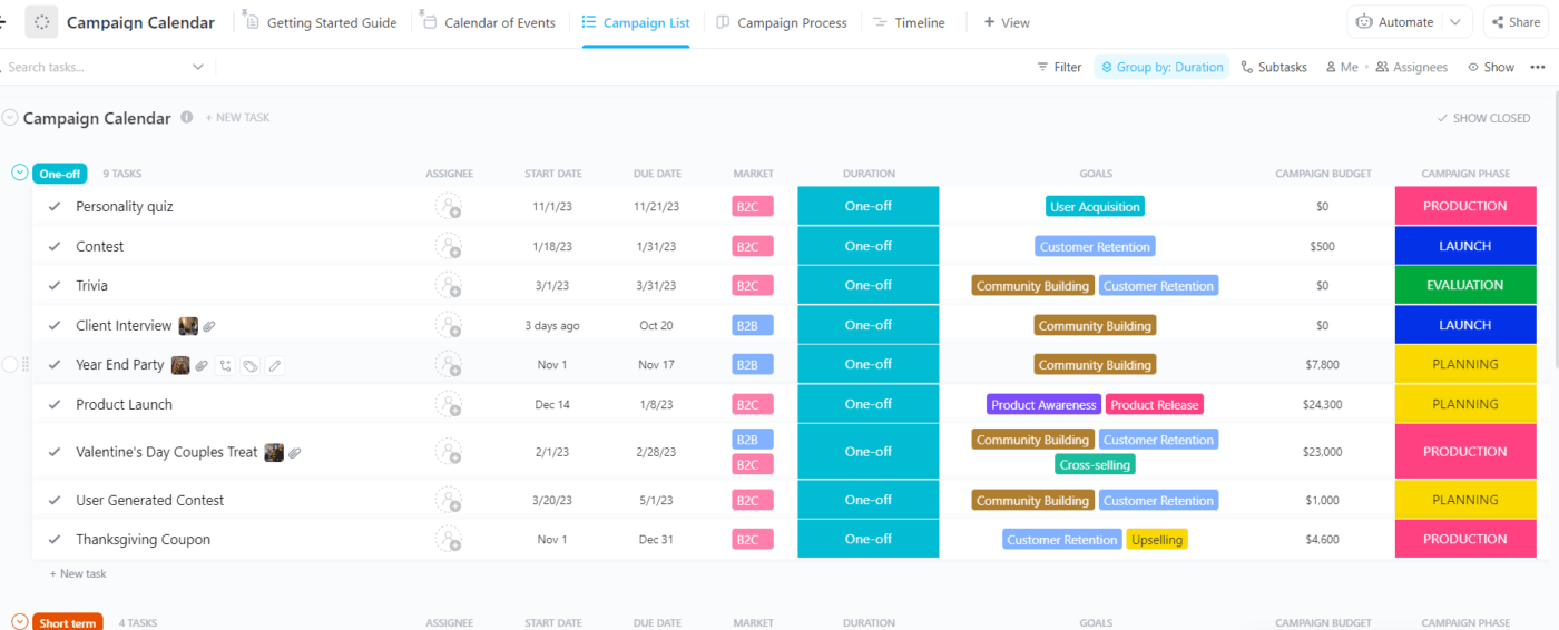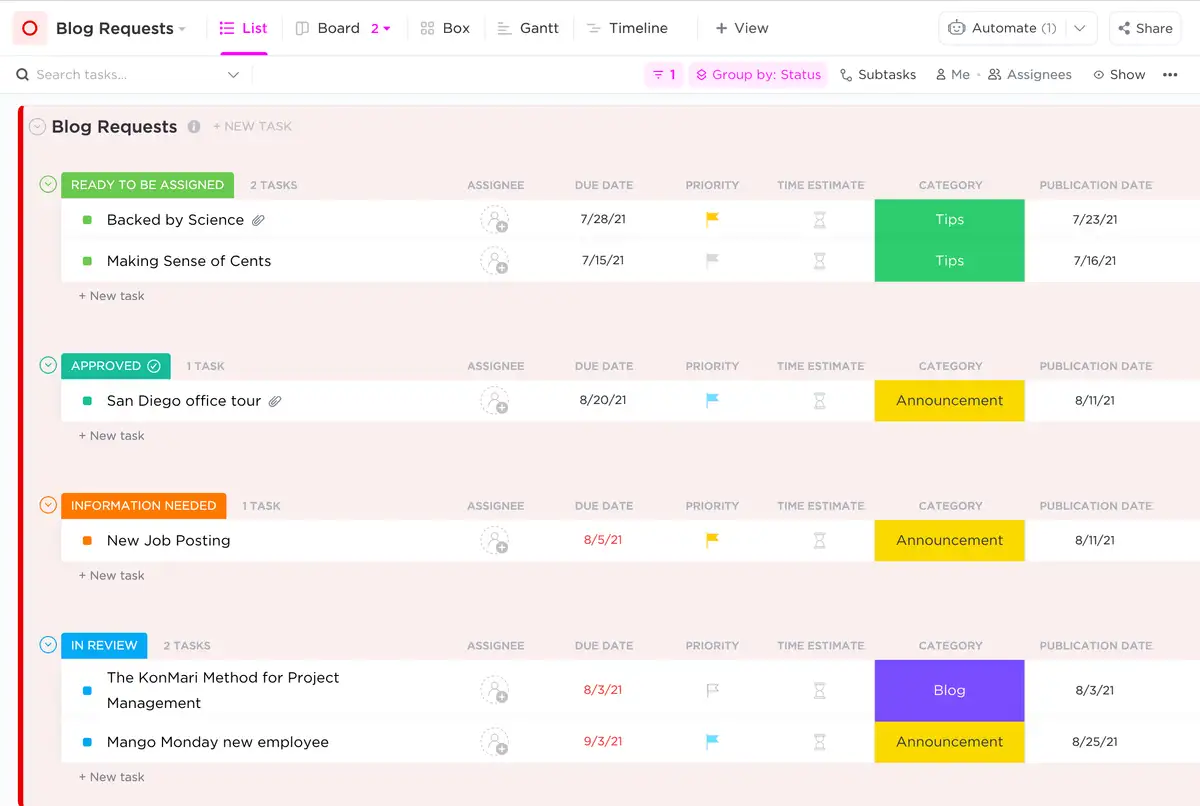 Get a bird’s-eye view of your entire publishing schedule with ClickUp Calendar View. Stop guessing what’s coming next and see your whole month at a glance. Easily drag and drop tasks to reschedule posts, switch between views, and color-code your content to quickly identify gaps in your editorial calendar.