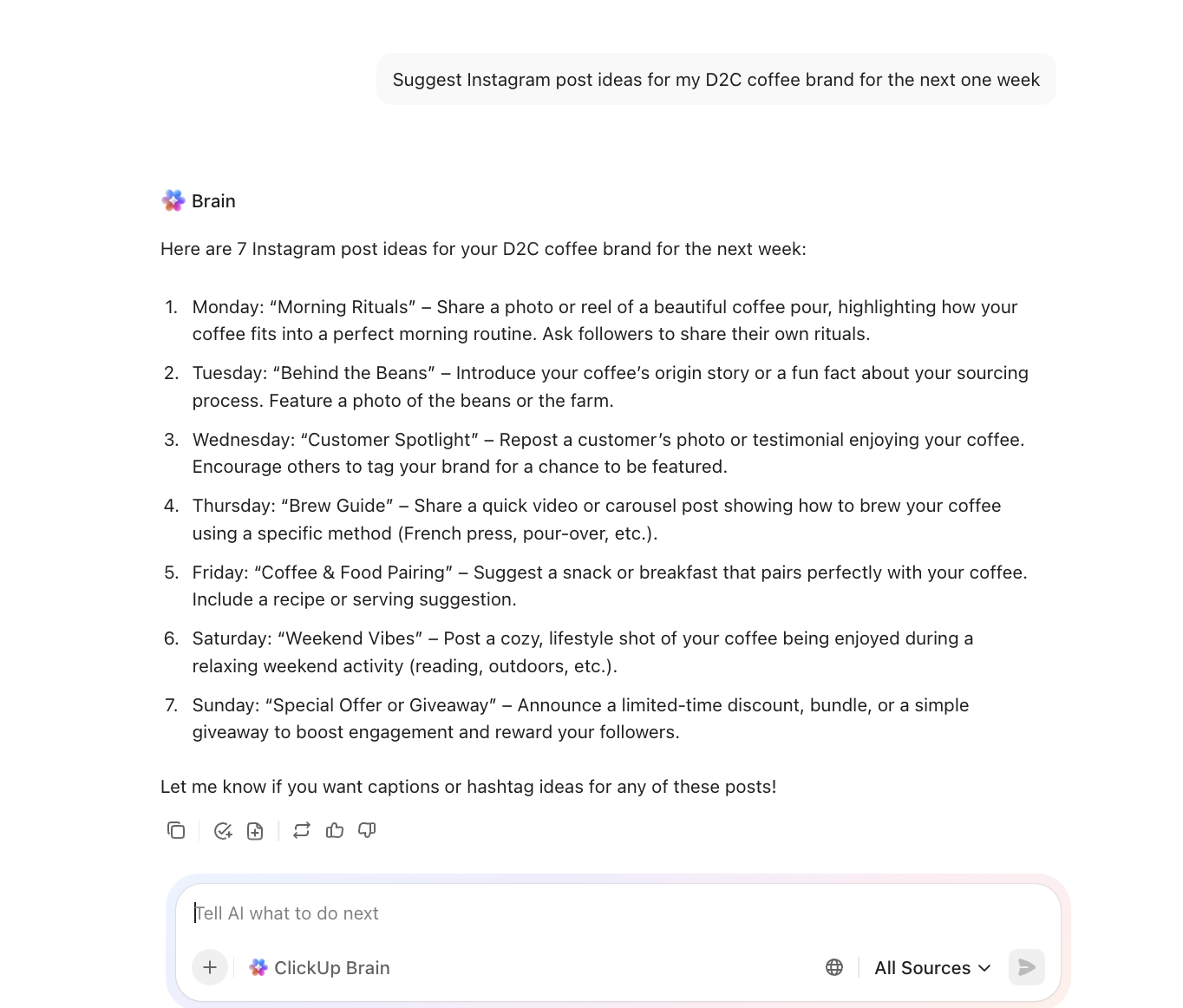 It references your existing tasks and projects for context, then generates ideas that are directly relevant to your brand and current initiatives, all within ClickUp Docs without you having to re-explain your brand or goals in every prompt.