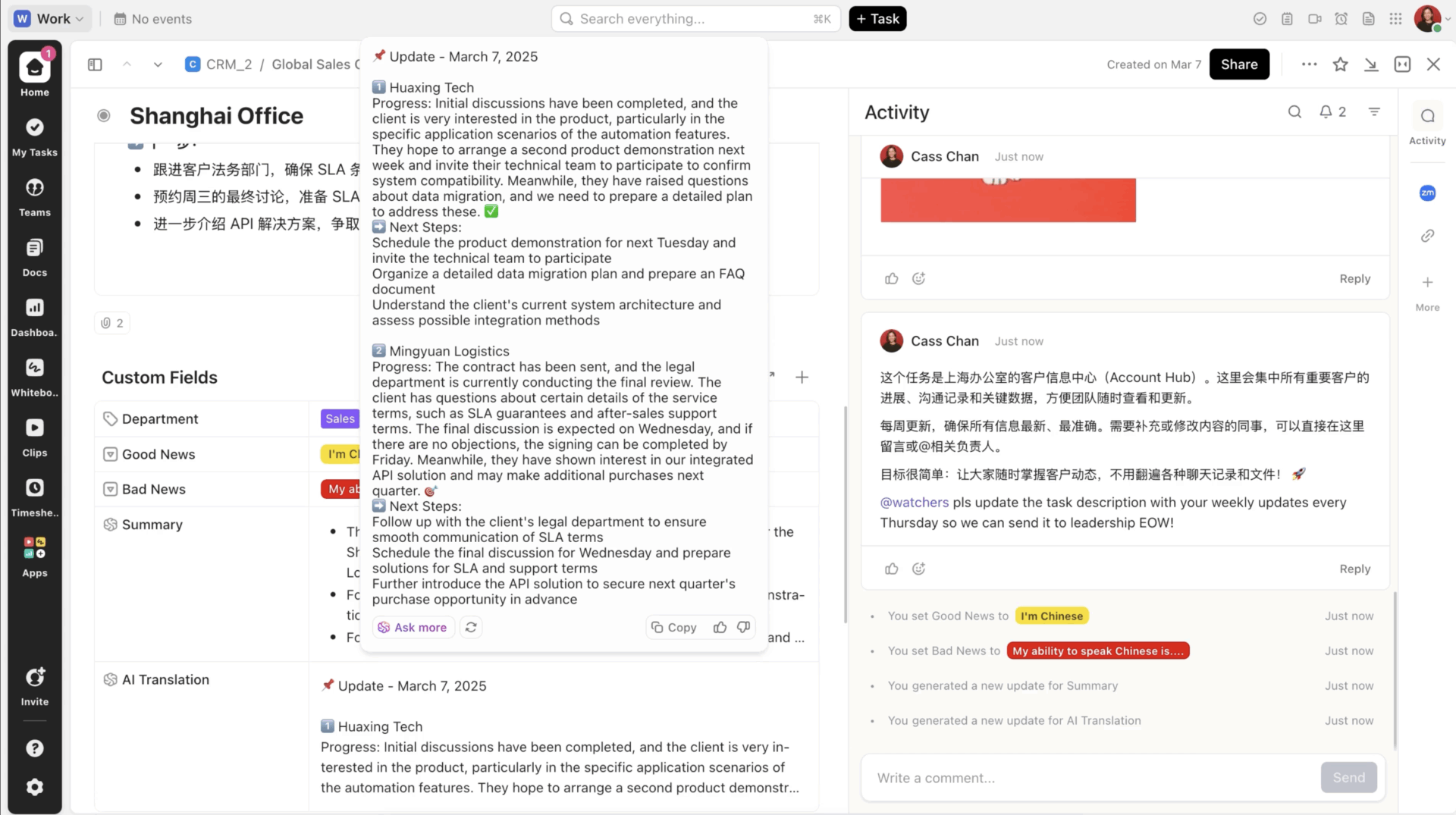 ClickUp BrainGPT lives right inside your tasks, Docs, and Chat, so reps can instantly summarize notes, pull key context, and draft replies without leaving the CRM workspace.
