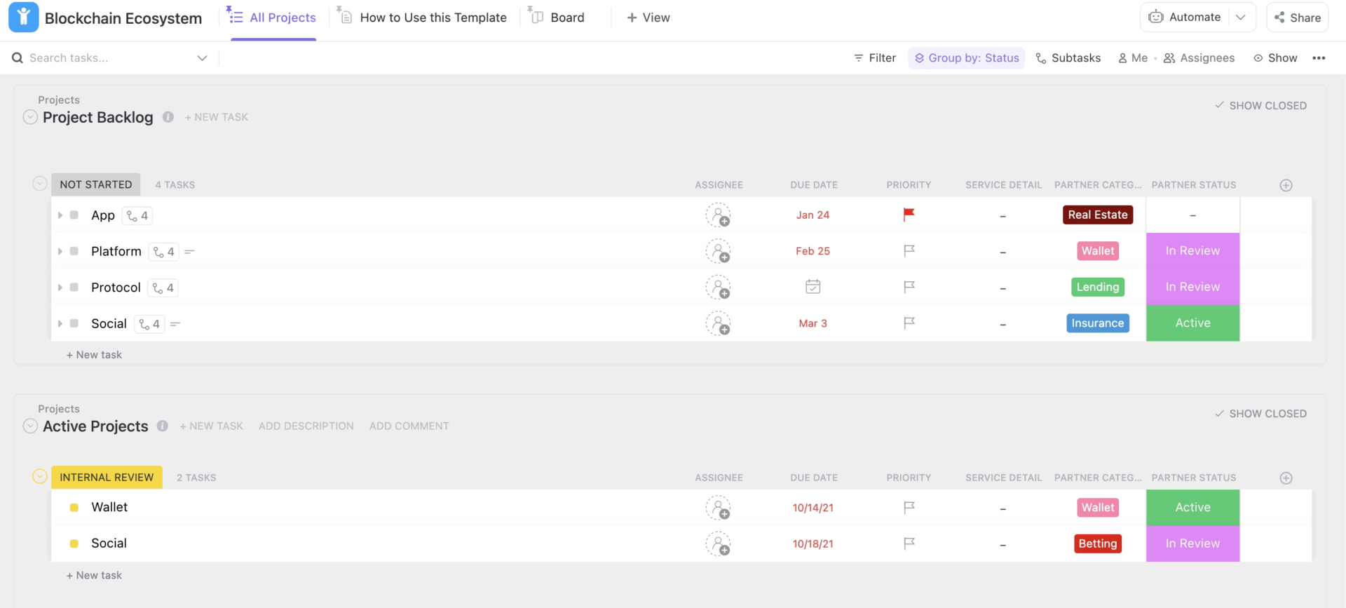 The ClickUp Blockchain Ecosystem Template gives you a single view of projects, people, and milestones around a chain or sector. Instead of scattered docs and ad hoc notes, you get Lists and Boards that show which protocols you follow, what they are building, and when key dates land.