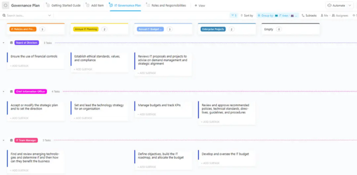 | Governance Plan Template by ClickUp | Get free template | Centralizing governance scope and program structure | Governance charter, stakeholder roles, program maturity tracking |