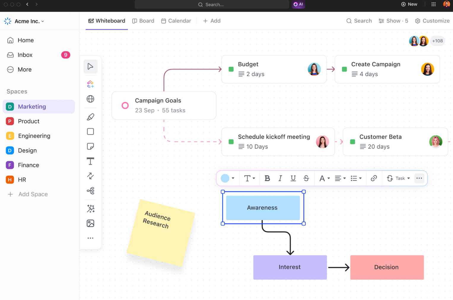 ClickUp is an all-in-one project management and productivity tool that offers built-in diagram features to create flowcharts or Gantt charts. With its flexible and customizable interface, project managers can efficiently create diagrams or simple flowcharts and visualize complex visuals through its Whiteboard tool.