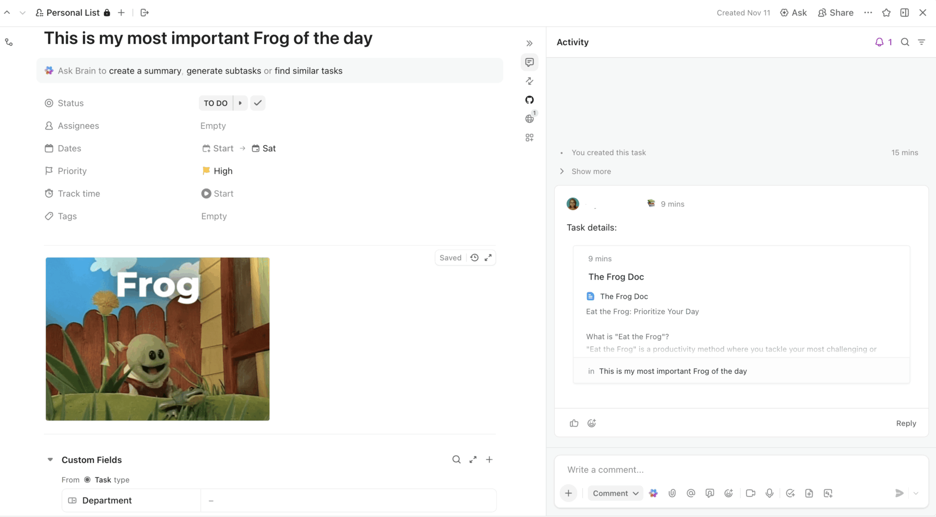 For example, in ClickUp, your Tasks are directly connected to Docs, and the ‘Ask AI’ option is directly available within the task too.