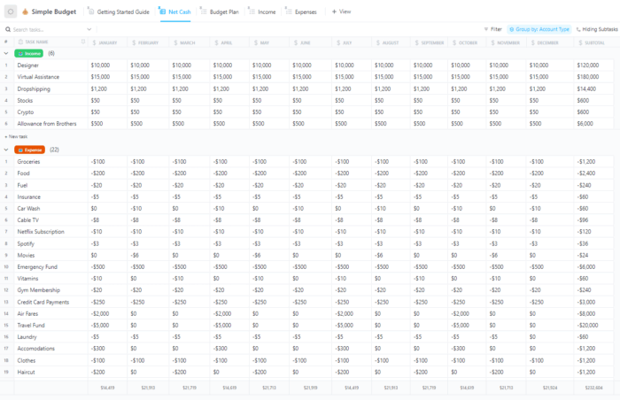 The ClickUp Simple Budget Template is quite straightforward and in-depth. The solution instantly saves budget information with 16 pre-designed Custom Fields.