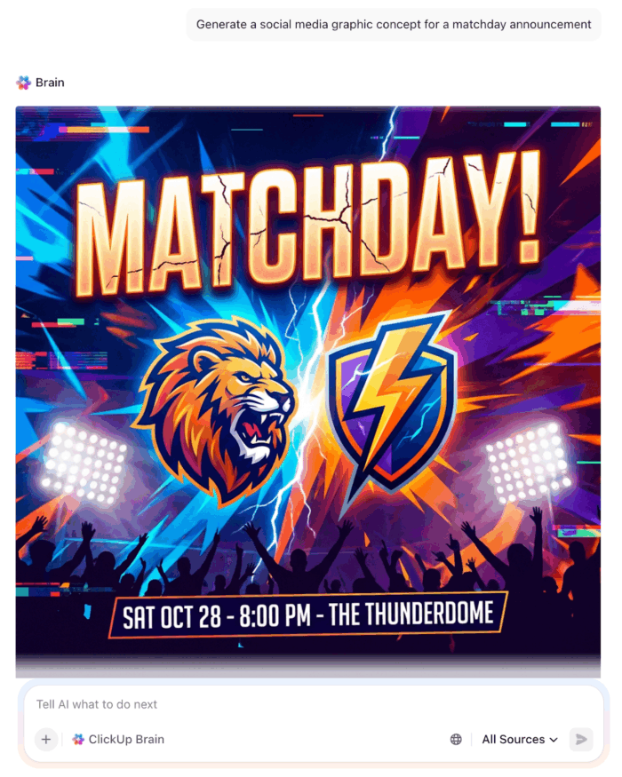 And when you need visuals, Brain can generate images to support quick social concepts, draft matchday graphics, or placeholder brand assets you want to review before designing.