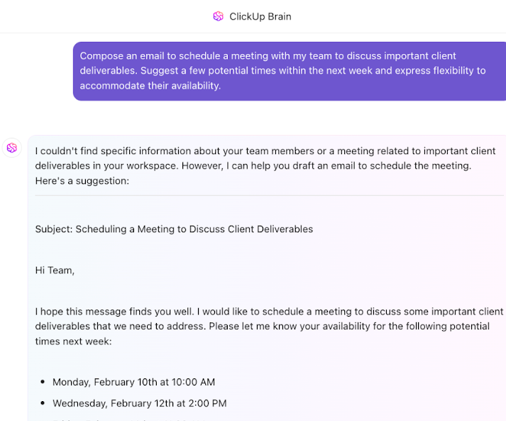 Not with ClickUp Brain, though. It lives right in your Workspace, knows what you’re working on, can understand plain text prompts, and gives you answers that are highly relevant to your tasks! Experience 2x improvement in productivity with ClickUp!
